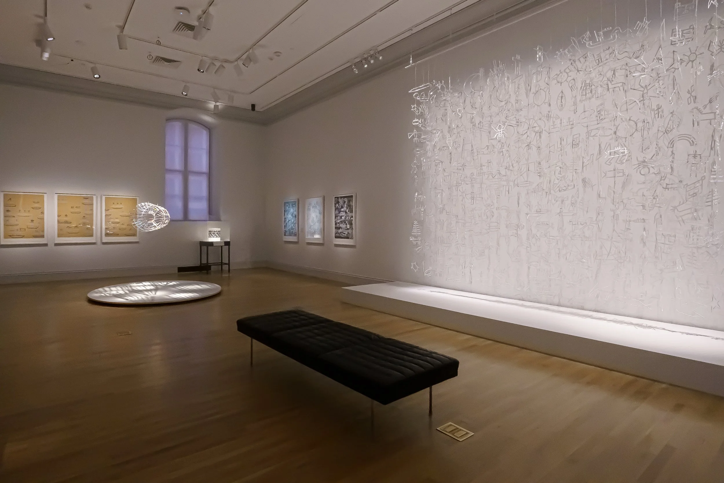 Charmed (Bestiary), 2022-23, fused glass and filament, approx. 120 x 180 x 10 inches. Installation view of "Sharing Honors and Burdens: Renwick Invitational 2023," Renwick Gallery of the Smithsonian American Art Museum, 2023, Courtesy of Smithsonian American Art Museum; Photo by Albert Ting.